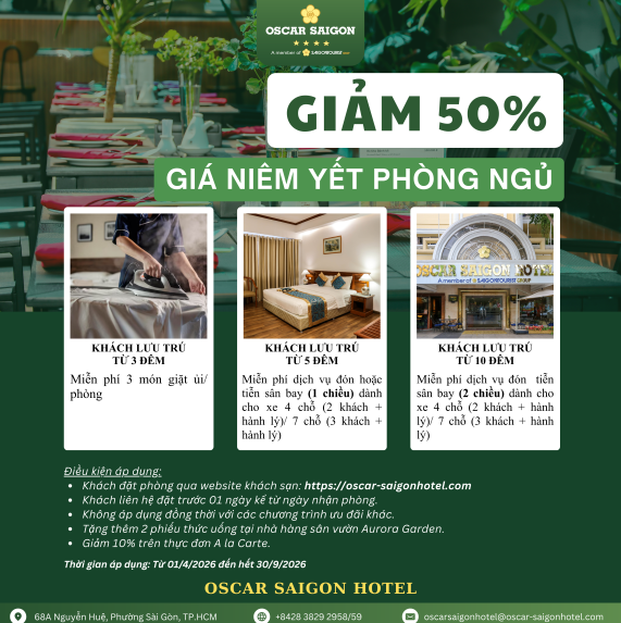 – Applicable for direct bookings via the Website: oscar-saigonhotel.com.